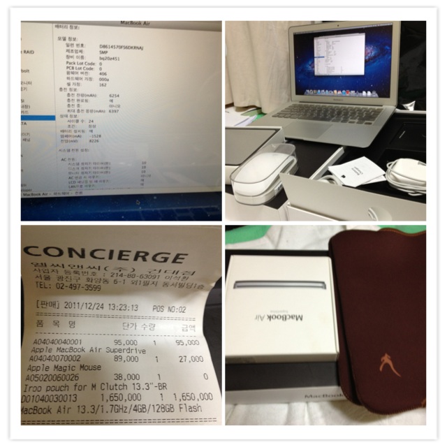 Apple MAc Book AIR 13" (풀바디 필름 부착 완료) + Apple Magic Mouse + Apple Mackbook Air Super Drive + 기본 파우치 + Apple Battery Charger + 키보드 키스킨 포함입니다.