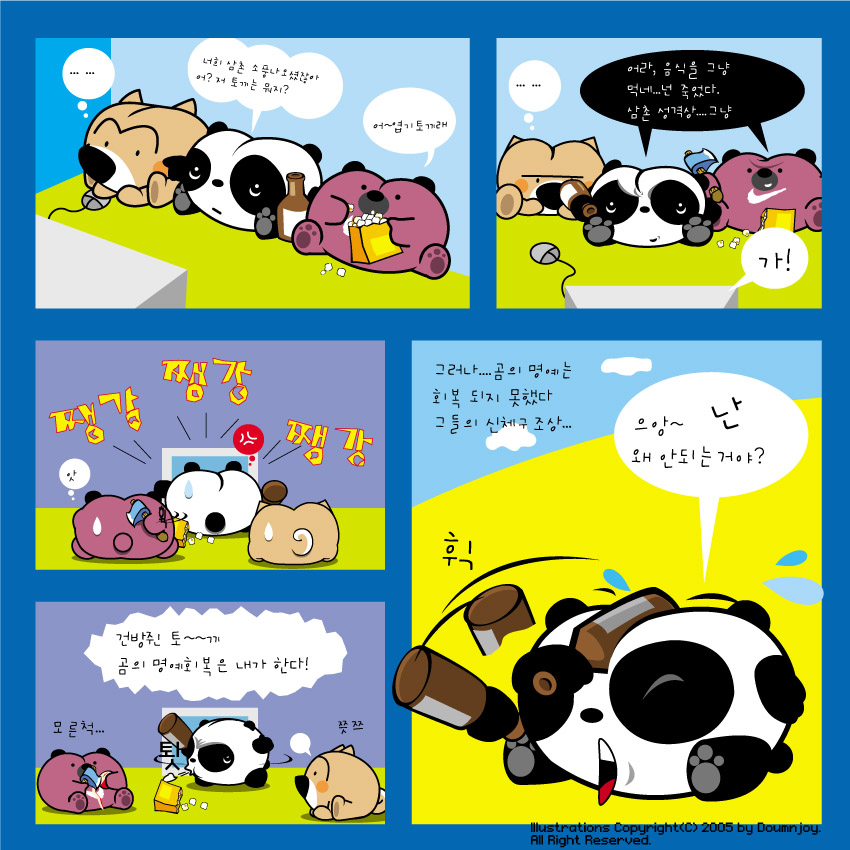 설명을 듯 붙이자면...옛날에 엽기 토끼..있었잖아요..거기서..곰이 뭘 먹는데 토끼가 뺏어 먹었잖아요...그 장면을 보면서 하는 얘기입니다... 아주 아주 오래전에 그려났던거라...;;; 너무어설퍼서...에고;;=3 =3 =3 =3